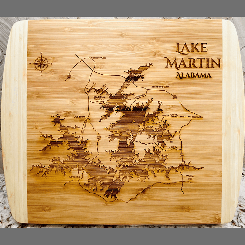 Beautifully crafted 13 1/2″ x 11 1/2″ natural bamboo cutting board. Gorgeous two tone coloring and is beautifully detailed, laser engraved and precision cut topographical Map of Lake Martin.